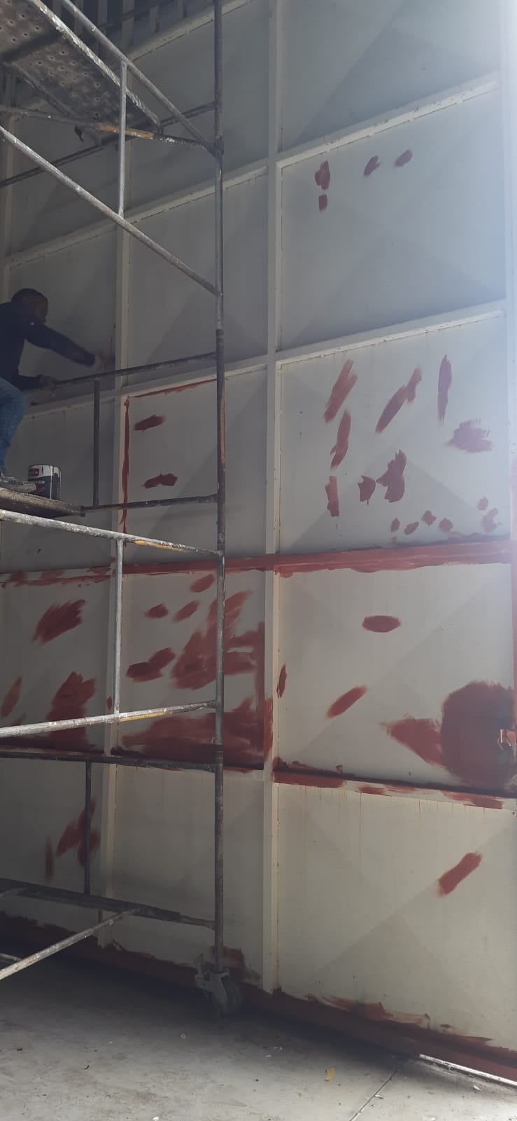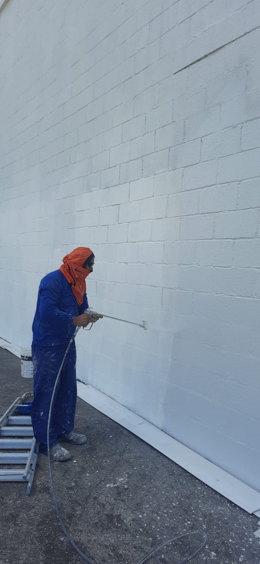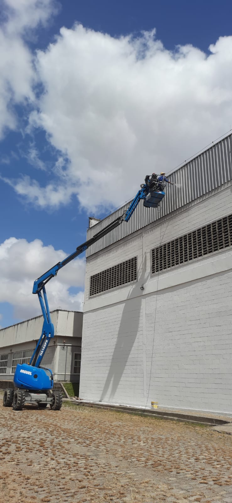 - Limpeza da fachada e pintura com tinta latex externa, utilizando plataforma articulada e máquina de pintura airless.